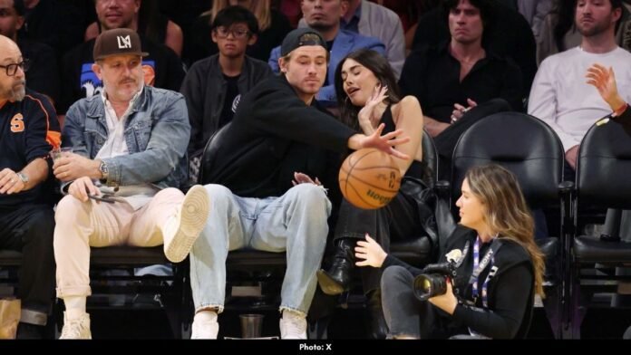 While posing for photos with Madison Beer, Herbert’s quick reactions stole the spotlight. A loose basketball flew toward the couple, and the quarterback was captured swiftly deflecting it away from Beer, protecting her courtside.