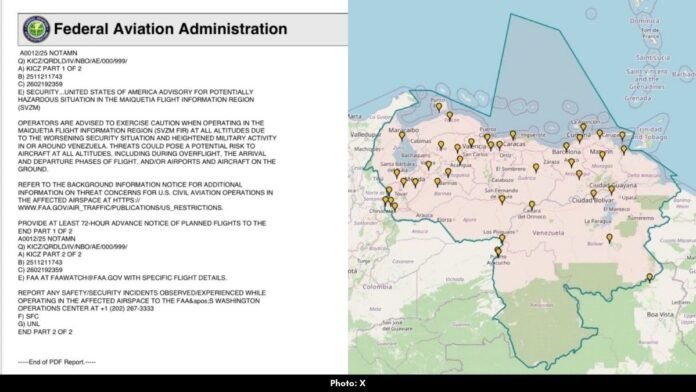 At 1:08 PM ET, the FAA released a Notice to Airmen advising pilots, airlines, and air traffic controllers of a “potentially hazardous situation” tied to growing instability and increased military activity around Venezuelan airspace.