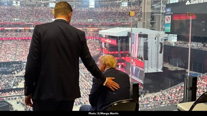 Former President Donald Trump appeared emotional during Charlie Kirk’s funeral service in Glendale, Arizona, on Sunday. Photos from the State Farm Stadium showed his son, Eric Trump, standing beside him and gently rubbing his back, offering comfort before his speech.